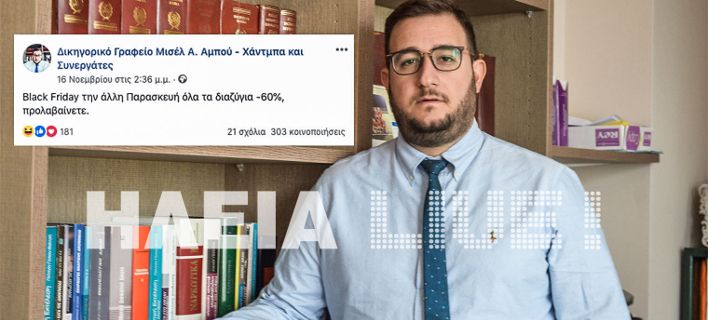 «Μιας και είμαστε όλοι λάτρεις των social media και του διαδικτύου γενικότερα, αντιλήφθηκα πολλές διαφημίσεις που ανέφεραν τις προσφορές για την Black Friday… Καταστήματα, πολυκαταστήματα, επιχειρήσεις… Στο πλαίσιο της χιουμοριστικής διάθεσης που είχα και εγώ τη στιγμή εκείνη, έκανα μια ανάρτηση από τη σελίδα του δικηγορικού γραφείου μου, βάζοντας κάτι «πιασάρικο», δηλαδή μια αναφορά σε ένα συναινετικό διαζύγιο, αναφέροντας πως «ενόψει Black Friday όλα τα συναινετικά διαζύγια -60%, προλαβαίνετε». Να διευκρινίσω επειδή είναι και θέμα αθέμιτου ανταγωνισμού και της κατώτερης αμοιβής από την οποία δεν μπορούμε να ξεφύγουμε και δεν πρέπει, γιατί θα μας χωρίσουν εμάς οι γυναίκες μας αν κάνουμε κάτι τέτοιο, ότι δεν υφίσταται καμία τέτοια προσφορά και ότι όλο αυτό έχει να κάνει με το χιούμορ που πρέπει να έχουμε στη ζωή μας, στο επάγγελμά μας, στην καθημερινότητά μας και στα σοβαρά και στα ανάλαφρα» είπε ο κ. Αμπού Χάντμπα που διακρίνεται για το χιούμορ του.