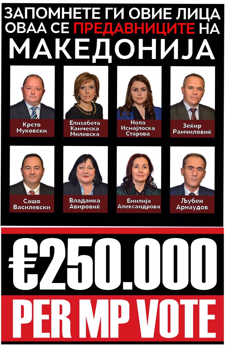 Πρόκειται για τους: Ελιζαμπέτα Κάντσεφσκα – Μίλεσκα (πρώην Υπουργός Πολιτισμού), Σάσο Βασίλιεφσκι, Κρστο Μούκοσκι, Λιούμπεν Αρναούντοφ, Βλάντανκα Αβίροβιτς, Εμίλια Αλεξάντροβα, Νόλα Ισμαήλοβα -Σταρόβα και Ζεκίρ Ραμτσίλοβιτς, με την ιστοσελίδα republika.mk να δημοσιεύει τις φωτογραφίες τους και να τους αποκαλεί προδότες.