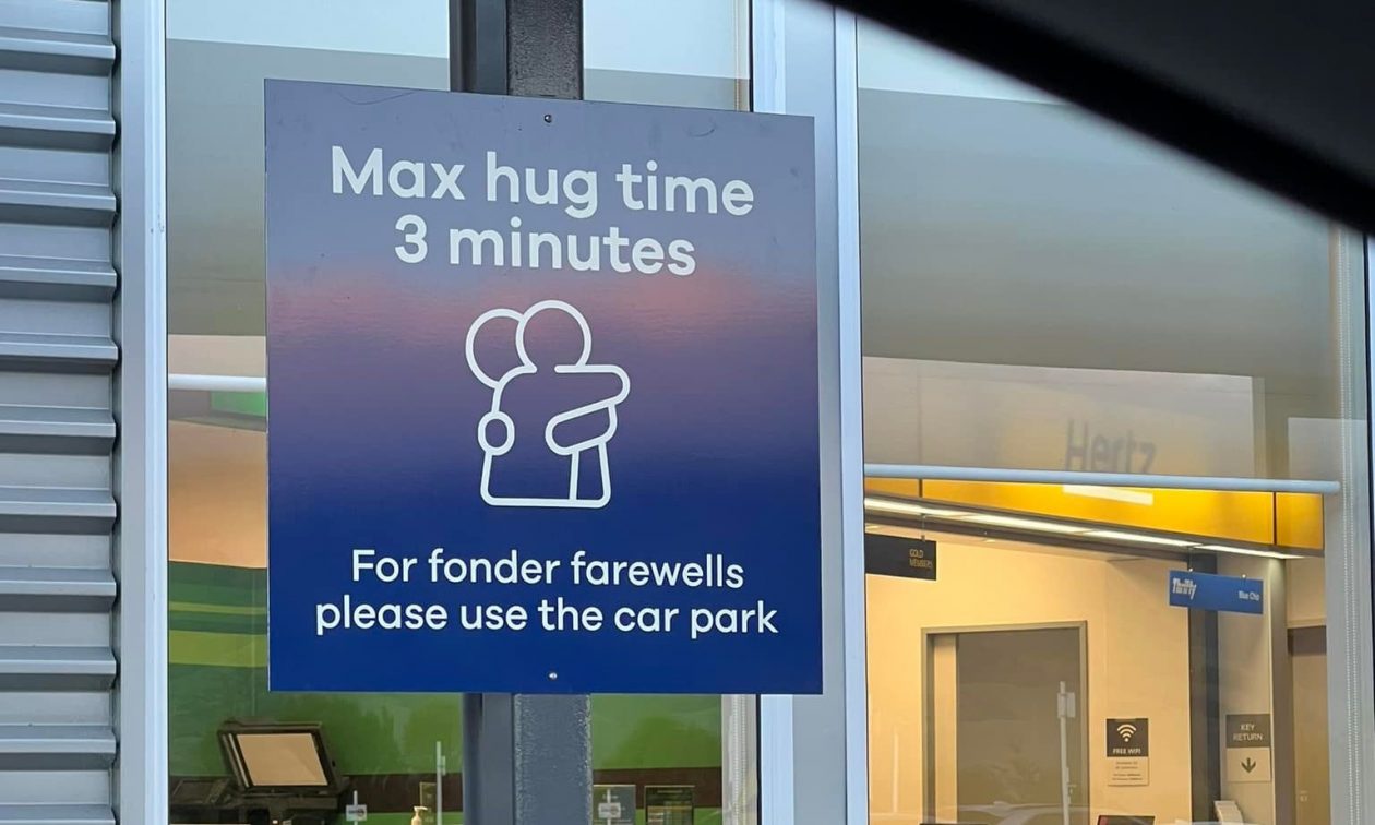 Συγκεκριμένα, πινακίδα που έχει τοποθετηθεί στη ζώνη αναχωρήσεων του αεροδρομίου στο Ντάνεντιν, μια πόλη στο Νότιο Νησί, προειδοποιεί: «Μέγιστος χρόνος αγκαλιάς 3 λεπτά. Για πιο έντονες αποχαιρετισμούς παρακαλούμε χρησιμοποιήστε το χώρο στάθμευσης».