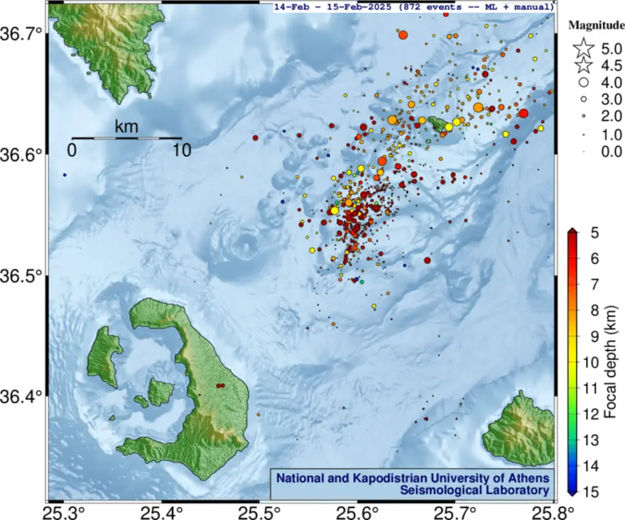 Από την έναρξη της σεισμικής δραστηριότητας στη ζώνη Σαντορίνης-Αμοργού στις 26 Ιανουαρίου έως και τις 14 Φεβρουαρίου 2025, το Εργαστήριο Σεισμολογίας (ΕΣ) του ΕΚΠΑ (http://dggsl.geol.uoa.gr/) έχει ανιχνεύσει και εντοπίσει συνολικά, με αυστηρά κριτήρια για τη διασφάλιση της ποιότητας των αποτελεσμάτων, πάνω από 19.200 σεισμούς με μεθόδους μηχανικής μάθησης (τεχνητής νοημοσύνης), εκ των οποίων άνω των 16.900 με μεγέθη Μ³1.0.