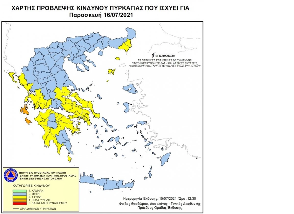 Σύμφωνα με το Χάρτη Πρόβλεψης Κινδύνου Πυρκαγιάς που εκδίδει η Γενική Γραμματεία Πολιτικής Προστασίας του Υπουργείου Προστασίας του Πολίτη (www.civilprotection.gr), για αύριο Παρασκευή 16 Ιουλίου 2021, προβλέπεται πολύ υψηλός κίνδυνος πυρκαγιάς (κατηγορία κινδύνου 4) για τις εξής περιοχές: