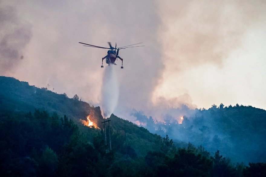 Οι άνεμοι που πνέουν αυτή την ώρα στο νησί είναι ήπιοι και βοηθούν τις προσπάθειες των δυνάμεων πυρόσβεσης.