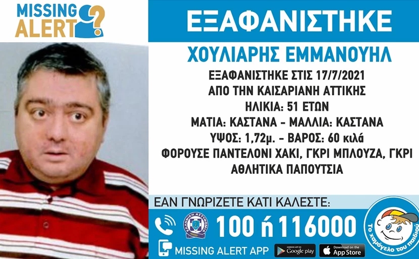 Σύμφωνα με ανακοίνωση από το Χαμόγελο του Παιδιού, πρόκειται για τον Χούλιαρη Εμμανουήλ, 51 ετών, του οποίου τα ίχνη χάθηκαν στις 17 Ιουλίου. Έχει ύψος 1,72 μ., έχει 60 κιλά βάρος, έχει καστανά μαλλιά και καστανά μάτια. Την ημέρα που εξαφανίστηκε φορούσε παντελόνι χακί, γκρι μπλούζα και γκρι αθλητικά παπούτσια.