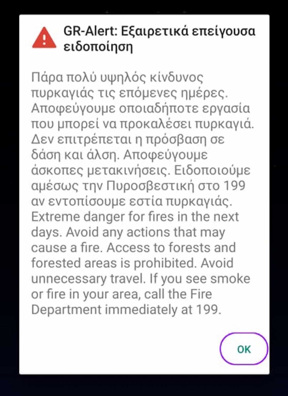 «Πολύ υψηλός κίνδυνος πυρκαγιάς τις επόμενες μέρες. Αποφεύγουμε οποιαδήποτε εργασία που μπορεί να προκαλέσει πυρκαγιά. Δεν επιτρέπεται η πρόσβαση σε δάση και άλση. Αποφεύγουμε άσκοπες μετακινήσεις. Ειδοποιούμε αμέσως την Πυροσβεστική στο 199 αν εντοπίσουμε εστία πυρκαγιάς» αναφέρει το μήνυμα.