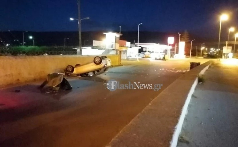 Tο αυτοκίνητο κατέληξε με τον ουρανό του στην άσφαλτο αφού πρώτα χτύπησε στο κράσπεδο του δρόμου. Η «προσγείωσή» του έγινε στον ακριβώς παράλληλο δρόμο που βρίσκεται στο ύψος του Ναυτικού Σταθμού Κρήτης στις Μουρνιές.