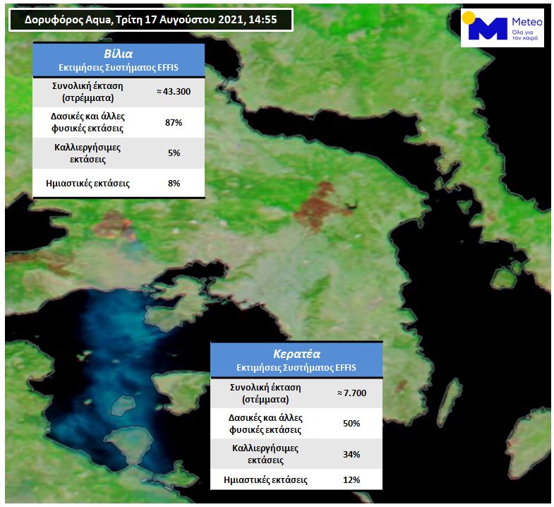 Στο σχήμα που ακολουθεί φαίνονται: (α) η εικόνα του περιβαλλοντικού δορυφόρου Aqua στις 14:55. Σε αυτή διακρίνονται (με καφέ αποχρώσεις) οι καμένες εκτάσεις σε Κερατέα, Βίλια και Βαρυμπόμπη αλλά και τα ενεργά μέτωπα της πυρκαγιάς στα Βίλια τη συγκεκριμένη στιγμή. (β) ένθετοι πίνακες με τις πρώτες εκτιμήσεις του EFFIS για την έκταση των καμένων περιοχών και τα κυριότερα είδη των περιοχών αυτών.