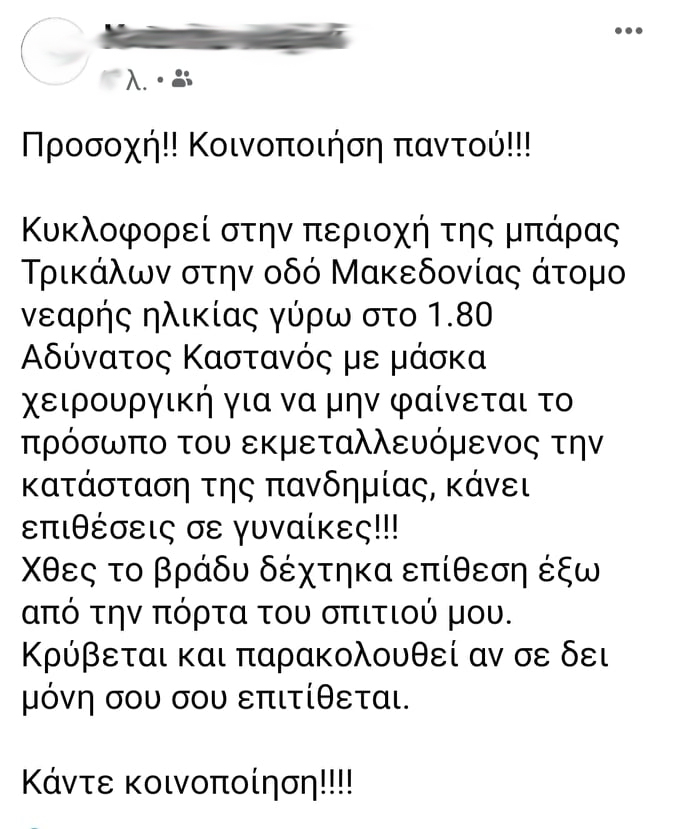 Σύμφωνα με ανάρτηση της ίδιας και στα μέσα κοινωνικής δικτύωσης άγνωστος άντρας, φορώντας προστατευτική μάσκα για τον κορωνοϊό, την πλησίασε αργά το βράδυ της Δευτέρας και ενώ ξεκλείδωνε την πόρτα της πολυκατοικίας στην οδό Μακεδονίας.