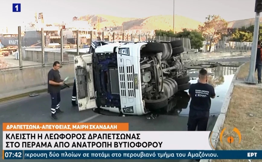 Κλειστή η λεωφόρος Δραπετσώνας λόγω ανατροπής βυτιοφόρου φορτηγού