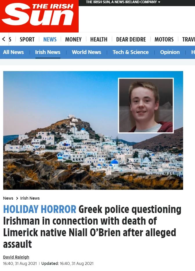 Ωστόσο, με ιδιαίτερο ενδιαφέρον παρακολουθούν τις εξελίξεις γύρω από τη δολοφονία και στην πατρίδα του 22χρονου θύματος. Μάλιστα η εφημερίδα «The Sun», στην ιρλανδική ηλεκτρονική της έκδοση δημοσιεύει το όνομα και τη φωτογραφία του νεαρού που δολοφονήθηκε στο νησί της Ίου.