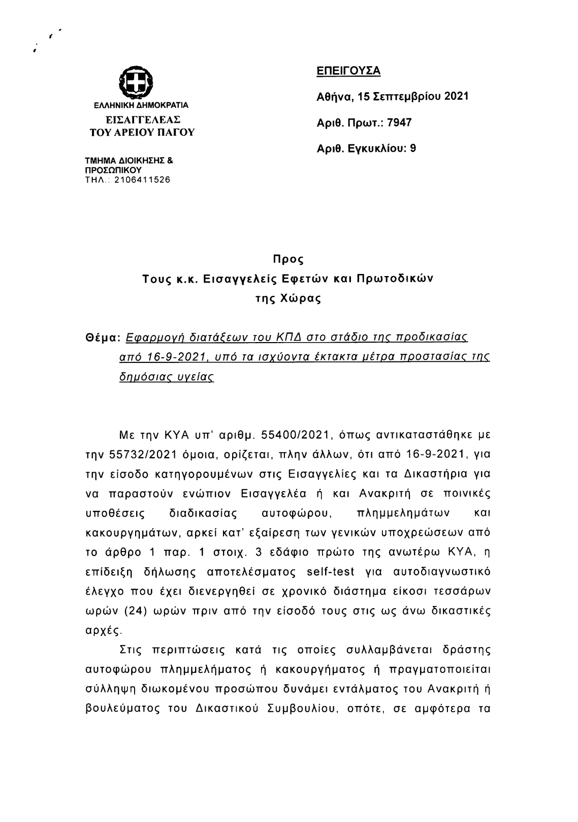 Απευθυνόμενος προς τις εισαγγελικές αρχές, τονίζει πως θα πρέπει να είναι αυστηροί πως προς τα λοιπά υγειονομικά μέτρα όπως η χρήση μάσκας και η τήρηση αποστάσεων από τους κατηγορούμενους που αρνούνται να υποβληθούν σε τεστ για τον κορωνοϊό.