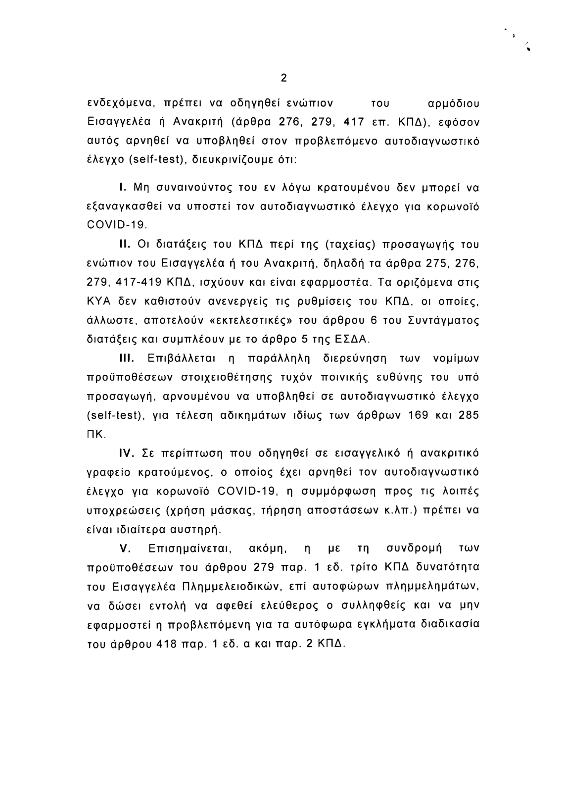 Ο κ. Πλιώτας επισημαίνει στην εγκύκλιο ότι οι δράστες αυτόφωρου πλημμελήματος ή κακουργήματος ή συλληφθέντα δυνάμει εντάλματος σύλληψης, δεν μπορούν να εξαναγκαστούν να υποστούν σε αυτοδιαγνωστικό έλεγχο για τον κορωνοϊό.