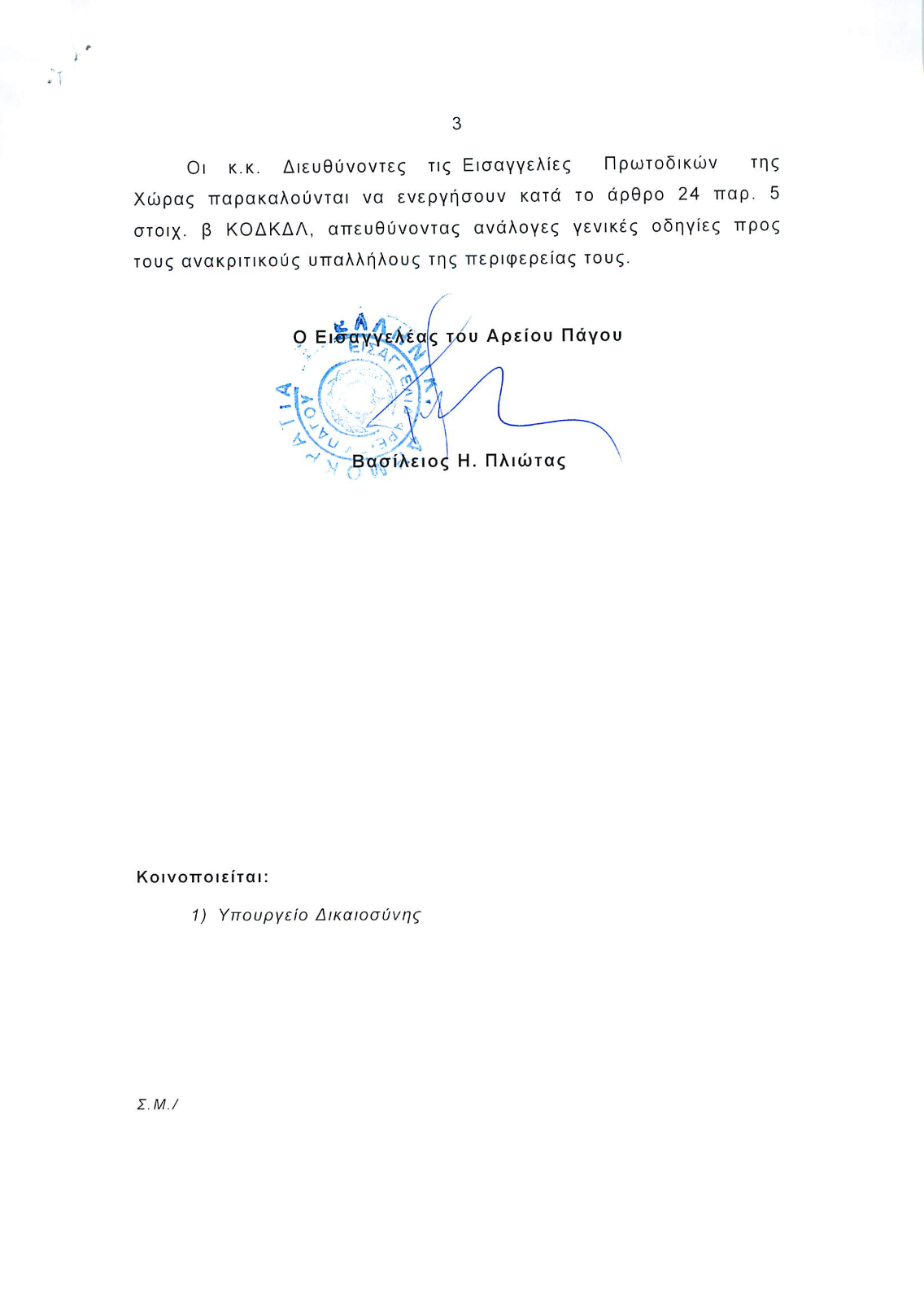 «Επισημαίνεται ακόμη η με τη συνδρομή των προϋποθέσεων του άρθρου 279 Κώδικα Ποινικής Δικονομίας, δυνατότητα του Εισαγγελέα Πλημμελειοδικών, επί αυτοφώρων πλημμελημάτων, να δώσει εντολή να αφεθεί ελεύθερος ο συλληφθείς και να μην εφαρμοστεί η προβλεπόμενη για τα αυτόφωρα εγκλήματα διαδικασία του άρθρου 418 παρ. 1 εδάφιο α΄ και 2 του Κώδικα Ποινικής Δικονομίας».