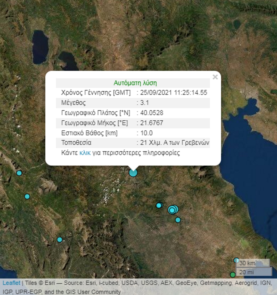 Ο σεισμός στα Γρεβενά έχει μέγεθος 3,1 βαθμών της κλίμακας Ρίχτερ, σύμφωνα με το Γεωδυναμικό Ινστιτούτο του Εθνικού Αστεροσκοπείου Αθηνών. Επίκεντρο της δόνησης είναι η περιοχή που βρίσκεται σε απόσταση 21 χιλιομέτρων ανατολικά της πόλης. Το εστιακό βάθος του σεισμού είναι στα 10 χιλιόμετρα.