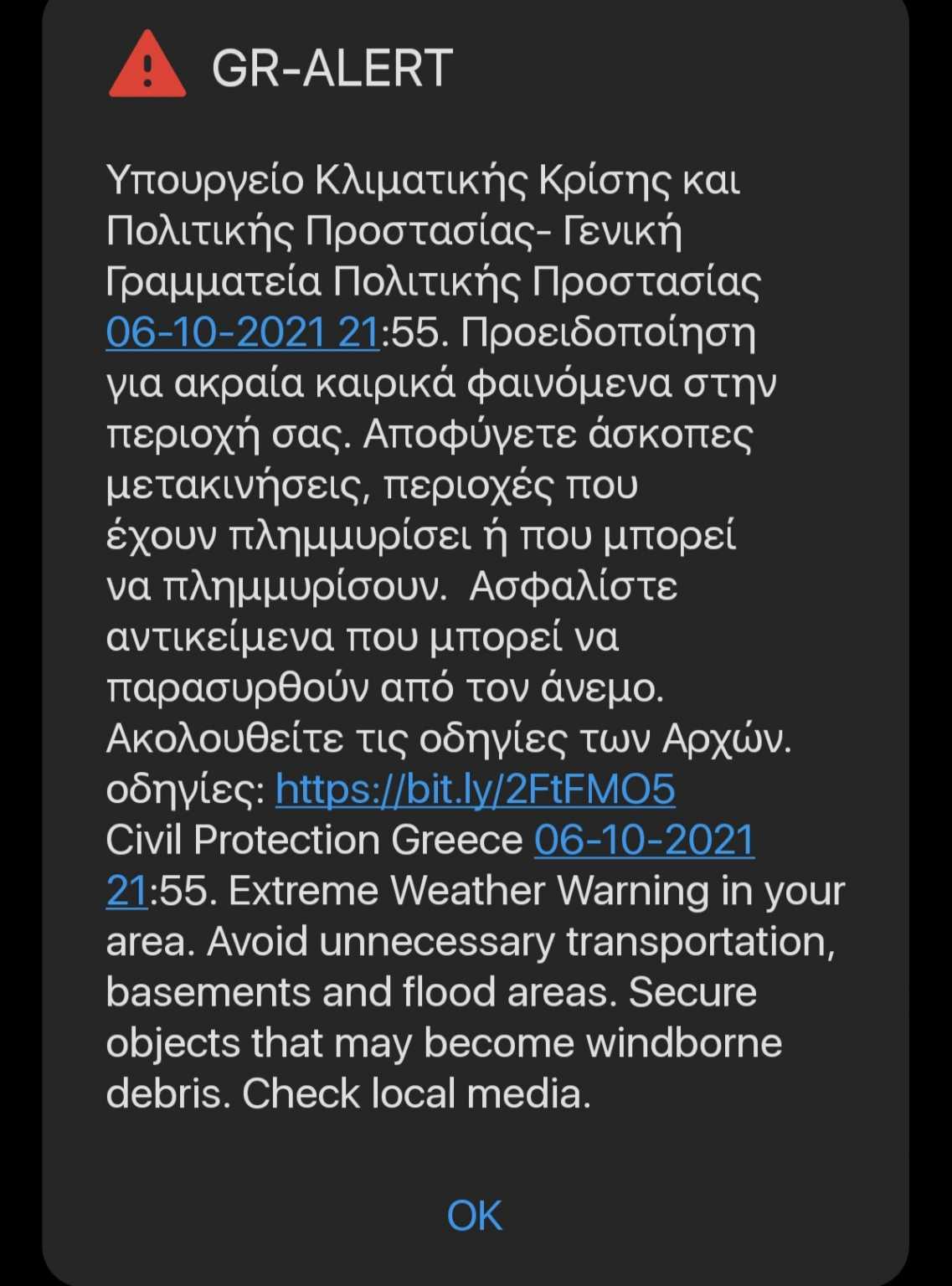 Στο μήνυμα που πήγε σε Κέρκυρα και Κεφαλονιά τονίζει στους κατοίκους να αποφεύγουν τις άσκοπες μετακινήσεις σε περιοχές που έχουν πλημμυρίσει ή μπορεί να πλημμυρίσουν.