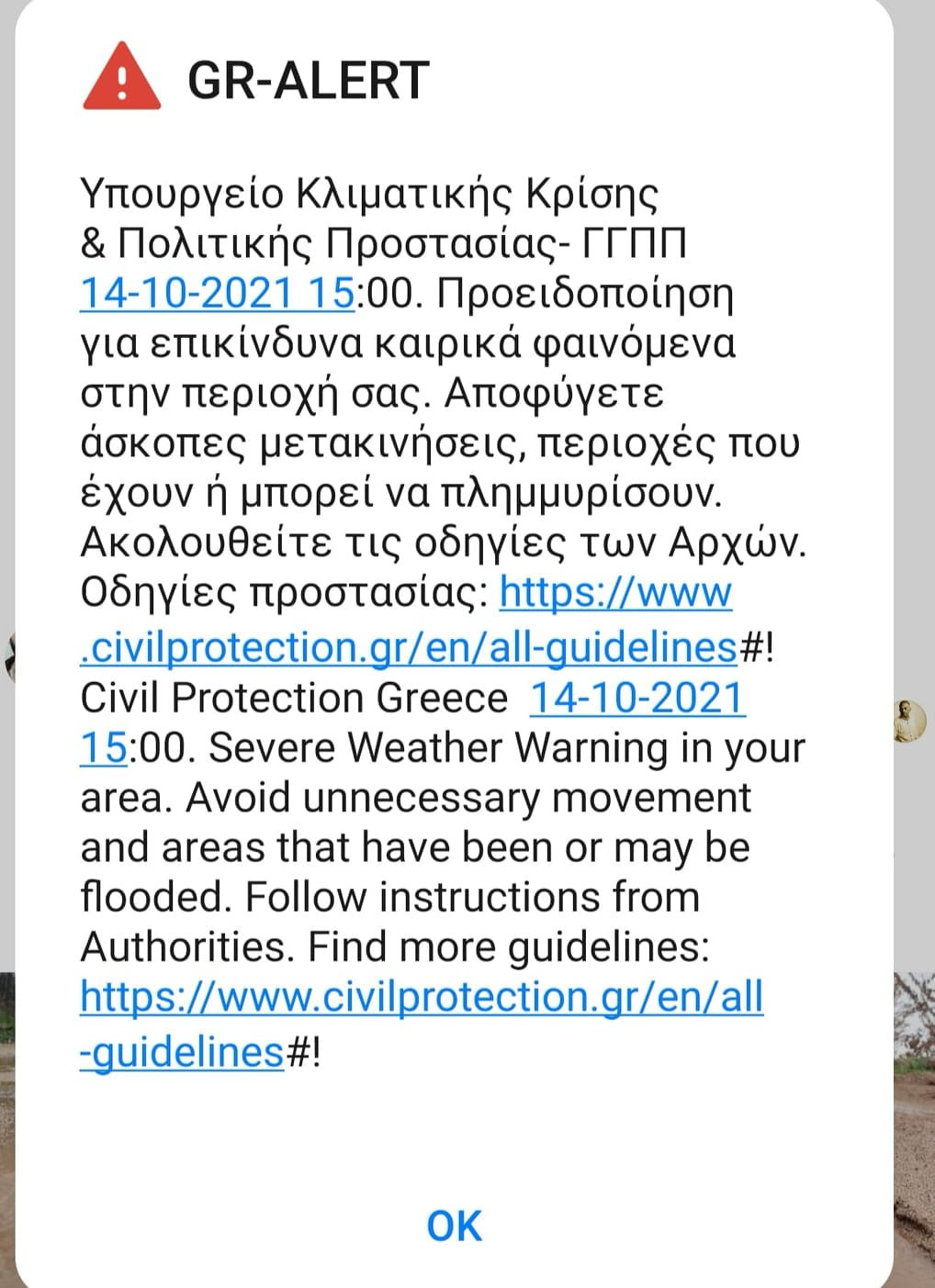 «Προειδοποίηση για επικίνδυνα καιρικά φαινόμενα στην περιοχή σας. Αποφύγετε άσκοπες μετακινήσεις, περιοχές που έχουν ή μπορεί να πλημμυρίσουν. Ακολουθείτε τις οδηγίες των αρχών», αναφέρει το μήνυμα.