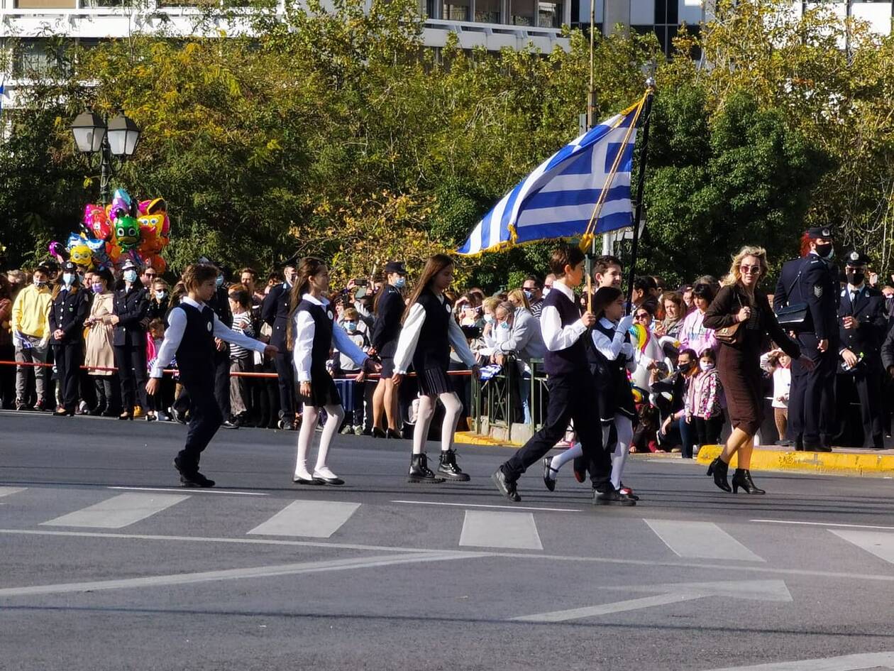 Στη φετινή παρέλαση παρελαύνουν οι σημαιοφόροι και οι παραστάτες των σχολείων της Αθήνας που επελέγησαν λόγω των υγειονομικών πρωτοκόλλων προκειμένου να αποφευχθεί ο συνωστισμός.
