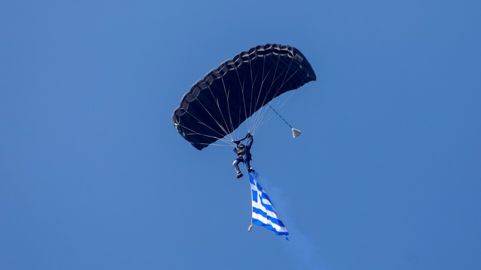Τις εντυπώσεις έκλεψαν οι πτώσεις δύο αλεξιπτωτιστών μπροστά στους επισήμους με τον έναν εξ αυτών να παραδίδει στην κ. Σακελλαροπούλου την ελληνική σημαία.