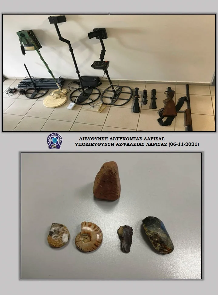 Ο δράστης εντοπίστηκε έξω από το σπίτι του όπου συνελήφθη και κατά την έρευνα στο εσωτερικό βρέθηκαν συνολικά μια πυραμοειδής κεραμική αγνύθα (υφαντικό βαρίδιο) που εμπίπτει στις προστατευτικές διατάξεις της νομοθεσίας σύμφωνα με εκτίμηση υπαλλήλου της Εφορείας Αρχαιοτήτων Λάρισας, τέσσερα απολιθώματα δυο εκ των οποίων σε σχήμα σαλιγκαριού και δυο προϊστορικά εργαλεία για τα οποία απαιτείται περαιτέρω εξέταση, τρεις ανιχνευτές μετάλλων, ένα ραβδοσκοπικό εργαλείο ανίχνευσης εδάφους που αποτελείται από δυο μεταλλικές βέργες και ηλεκτρονική συσκευή και ένας αυτοσχέδιος μηχανισμός για ανίχνευση μετάλλων και διασκόπηση του υπεδάφους που αποτελείται από οκτώ πλαστικούς σωλήνες και καλώδια.