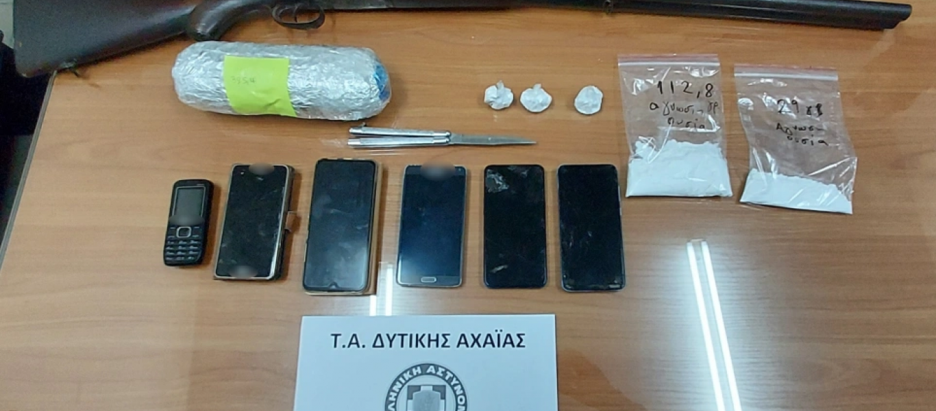 Πάνω του βρήκαν 36,5 γραμμάρια κοκαΐνης και 325,4 γραμμάρια ακατέργαστης κάνναβης τα οποία σκόπευε να διαθέσει προς πώληση, ενώ και κατά την έρευνα που ακολούθησε στην κατοικία του σε περιοχή της Ηλείας, οι αστυνομικοί κατέσχεσαν 141,8 γραμμάρια άγνωστης χημικής ουσίας για τη νόθευση της κοκαΐνης που εστάλη για ανάλυση, ένα κυνηγετικό όπλο το οποίο κατείχε παράνομα και ένα μαχαίρι τύπου “πεταλούδα”.