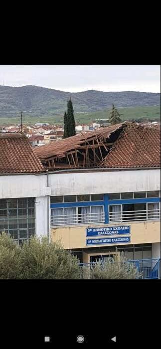 Όπως θα δείτε και στις παρακάτω εικόνες, άνοιξε μεγάλη τρύπα στην οροφή των συστεγασμένων σχολείων της Ελασσόνας, με τους γονείς να σπεύδουν να πάρουν τα παιδιά τους, τρομοκρατημένοι από τη ζημιά.