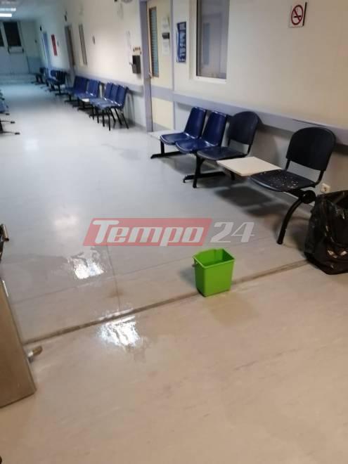 Όπως αποτυπώνεται, άνοιξε η οροφή με αποτέλεσμα το νερό να πλημμυρίσει χώρους του νοσοκομείου. Τα νερά τρέχουν στους τοίχους και οι εργαζόμενοι προσπαθούν να τα μαζέψουν με κουβάδες.