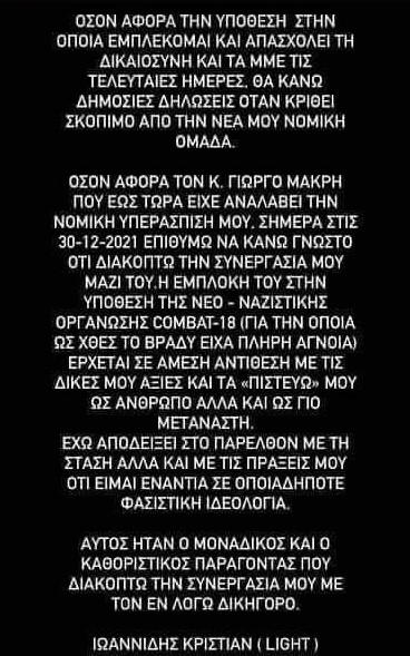 «Όσον αφορά στην εμπλοκή μου στην υπόθεση που απασχολεί τη δικαιοσύνη και τα ΜΜΕ, θα κάνω δηλώσεις όταν κριθεί σκόπιμο από τη νέα μου νομική ομάδα. Όσον αφορά τον κ. Γιώργο Μακρή που εως τώρα είχε αναλάβει τη νομική υπεράσπιση μου, σήμερα επιθυμώ να κάνω γνωστό πως διακόπτω τη συνεργασία μου μαζί του. Η εμπλοκή του στην υπόθεση της νεο-ναζιστικής οργάνωσης COMBAT-18 (για την οποία ως χθες το βράδυ είχα πλήρη άγνοια) έρχεται σε άμεση αντίθεση με τις δικές μου αξίες και τα «πιστεύω» μου ως άνθρωπο αλλά και ως γιο μετανάστη. Έχω αποδείξει στο παρελθόν με τη στάση αλλά και με τις πράξεις μου ότι είμαι ενάντια σε οποιαδήποτε φασιστική ιδεολογία».