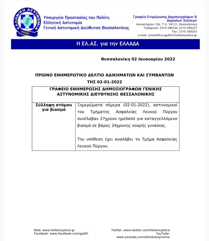 Η 24χρονη κοπέλα πέρασε στις 2 Ιανουαρίου το κατώφλι του Τμήματος Ασφαλείας του Λευκού Πύργου και κατέθεσε μήνυση εναντίον του 27χρονου για βιασμό, με αποτέλεσμα λίγες ώρες αργότερα ο γνωστός επιχειρηματίας να εντοπιστεί, οι αστυνομικοί να του περάσουν χειροπέδες και εν συνεχεία να περάσει από εισαγγελέα και ανακριτή.