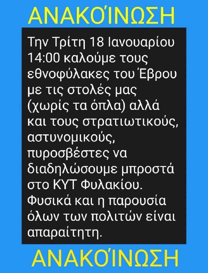 Νέα συγκέντρωση διαμαρτυρίας στο Φυλάκιο Ορεστιάδας, έξω από τα ΚΥΤ και ΠΡΟ.ΚΕ.ΚΑ και στον χώρο που ξεκίνησε η δημιουργία νέας δομής παράνομων μεταναστών, θα πραγματοποιήσει σήμερα Τρίτη 18 Ιανουαρίου στις 2 το μεσημέρι, ο λαός του Έβρου.