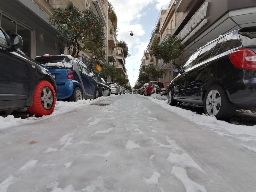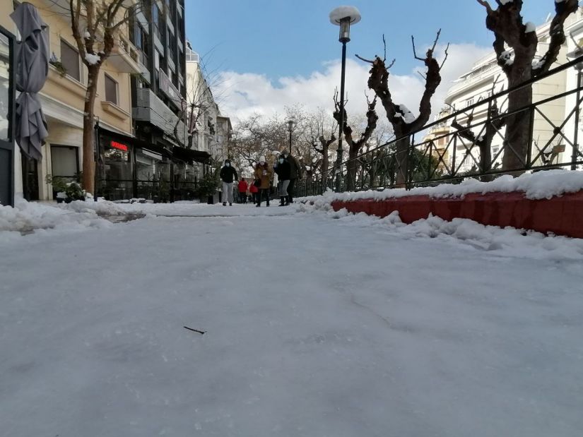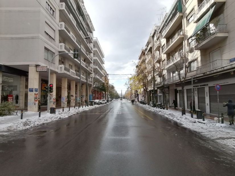 Το χιόνι δεν έχει λιώσει ούτε στην Πατησίων αφού η θερμοκρασία παραμένει πολύ χαμηλή.