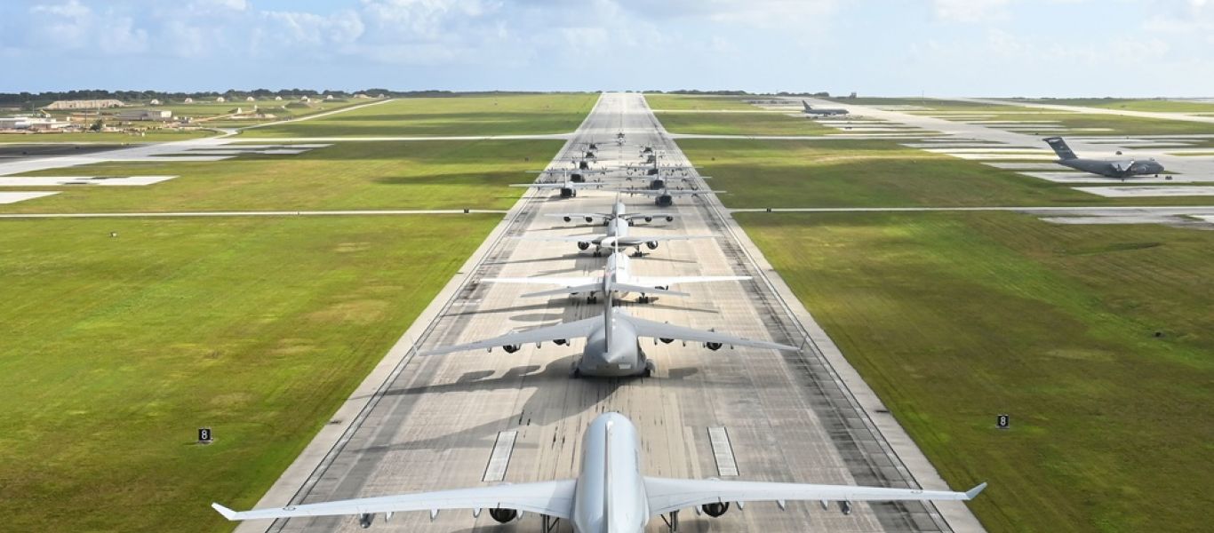Το δελτίο τύπου της Αεροπορίας του Ειρηνικού ανέφερε ότι τουλάχιστον 18 αεροσκάφη των ΗΠΑ, της Αυστραλίας, της Ιαπωνίας και των συμμάχων και συνεργατών τους συμμετείχαν σε μια δραστηριότητα στενού σχηματισμού, γνωστό ως Elephant Walk στην βάση της Αεροπορίας Άντερσεν, στην Γκουάμ, στις 5 Φεβρουαρίου, 2022.