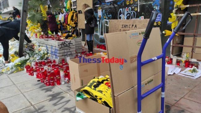 Εκπρόσωποι του Ερασιτέχνη Άρη έφτασαν στο σημείο από νωρίς το πρωί της Δευτέρας και με αφορμή την επικείμενη καταιγίδα που ενδεχομένως «χτυπήσει» με δυνατούς ανέμους και βροχοπτώσεις την πόλη της Θεσσαλονίκης, αποφάσισαν να προστατεύσουν τα εκατοντάδες αντικείμενα που συγκεντρώθηκαν στη μνήμη του Άλκη, πλην των κεριών και των λουλουδιών, σύμφωνα με το thesstoday.gr