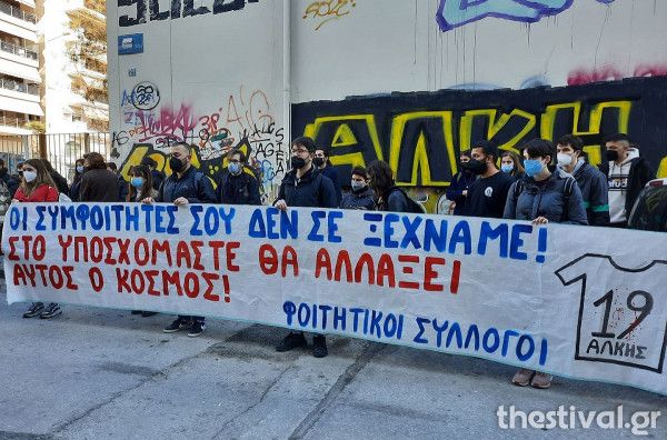 Στη συγκέντρωση βρέθηκαν και συμφοιτητές του Άλκη Καμπανού, οι οποίοι συγκίνησαν με το μήνυμά τους: “Οι συμφοιτητές σου δεν σε ξεχνάμε. Στο υποσχόμαστε θα αλλάξει αυτός ο κόσμος” αναφέρουν σε πανό.