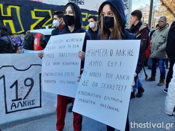 Σιωπηρή διαμαρτυρία στη μνήμη του Άλκη πραγματοποιούν αυτήν την ώρα φοιτητές και εκπαιδευτικοί στη Χαριλάου, στη Θεσσαλονίκη, στο σημείο της στυγερής δολοφονίας του 19χρονου.