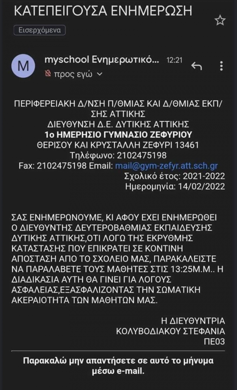 « Σας ενημερώνουμε κι αφού έχει ενημερωθεί ο διευθυντής της Δευτεροβάθμιας εκπαίδευσης Δυτικής Αττικής ότι λόγω της έκρυθμης κατάστασης που επικρατεί σε κοντινή απόσταση από το σχολείο μας, παρακαλείστε να παραλάβετε τους μαθητές στις 13.25. Η διαδικασία αυτή θα γίνει για λόγους ασφάλειας, εξασφαλίζοντας την σωματική ακεραιότητα των μαθητών μας».