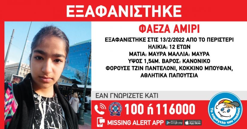 Όπως αναφέρει «Το Χαμόγελο του Παιδιού», σε ανακοίνωσή του: «Στις 13/02/2022, στις 12:20 ώρα, εξαφανίστηκε από την περιοχή του Περιστερίου, η Φαέζα (Faeza) Αμίρι (Amiri), 12 ετών, Ιρανικής καταγωγής.