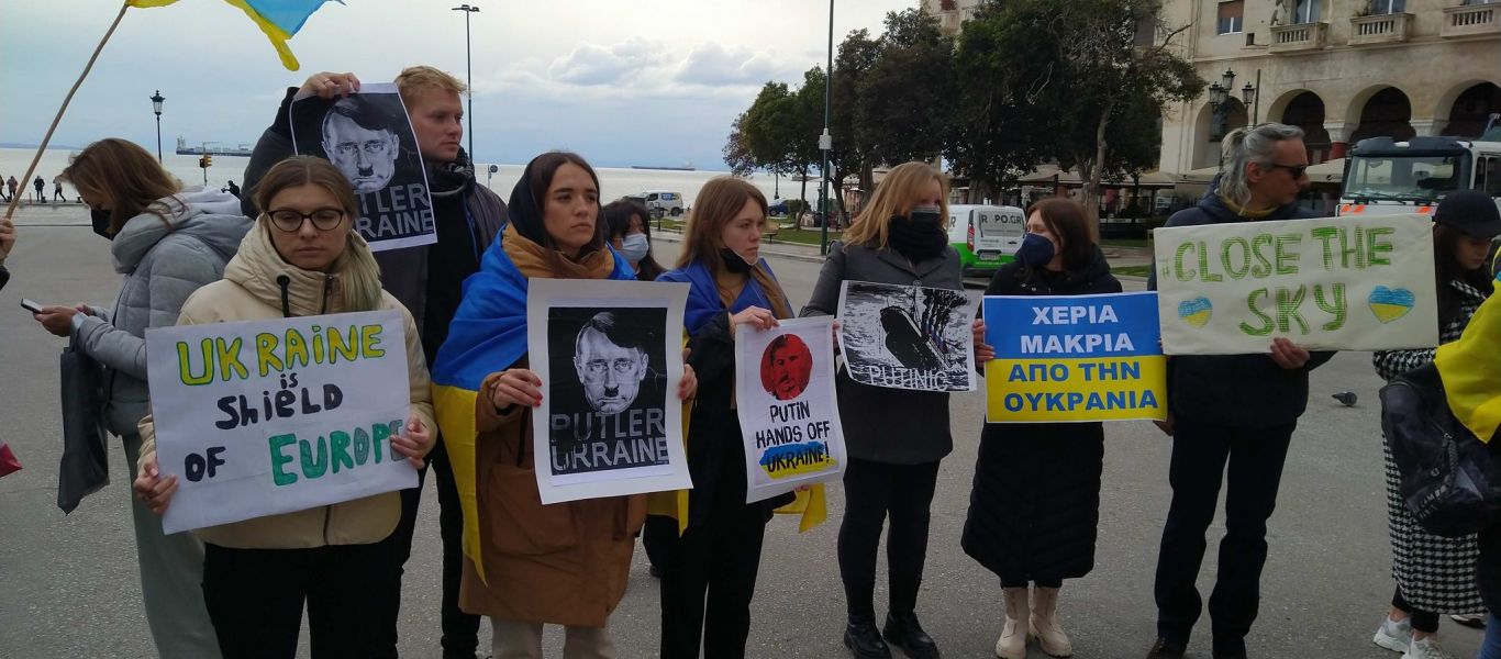 Το μεσημέρι της Δευτέρας Ουκρανοί πολίτες, πραγματοποίησαν συγκέντρωση διαμαρτυρίας, στην πλατεία Αριστοτέλους της Θεσσαλονίκης, λίγα 24ωρα μετά την επέμβαση της Ρωσίας στην Ουκρανία.