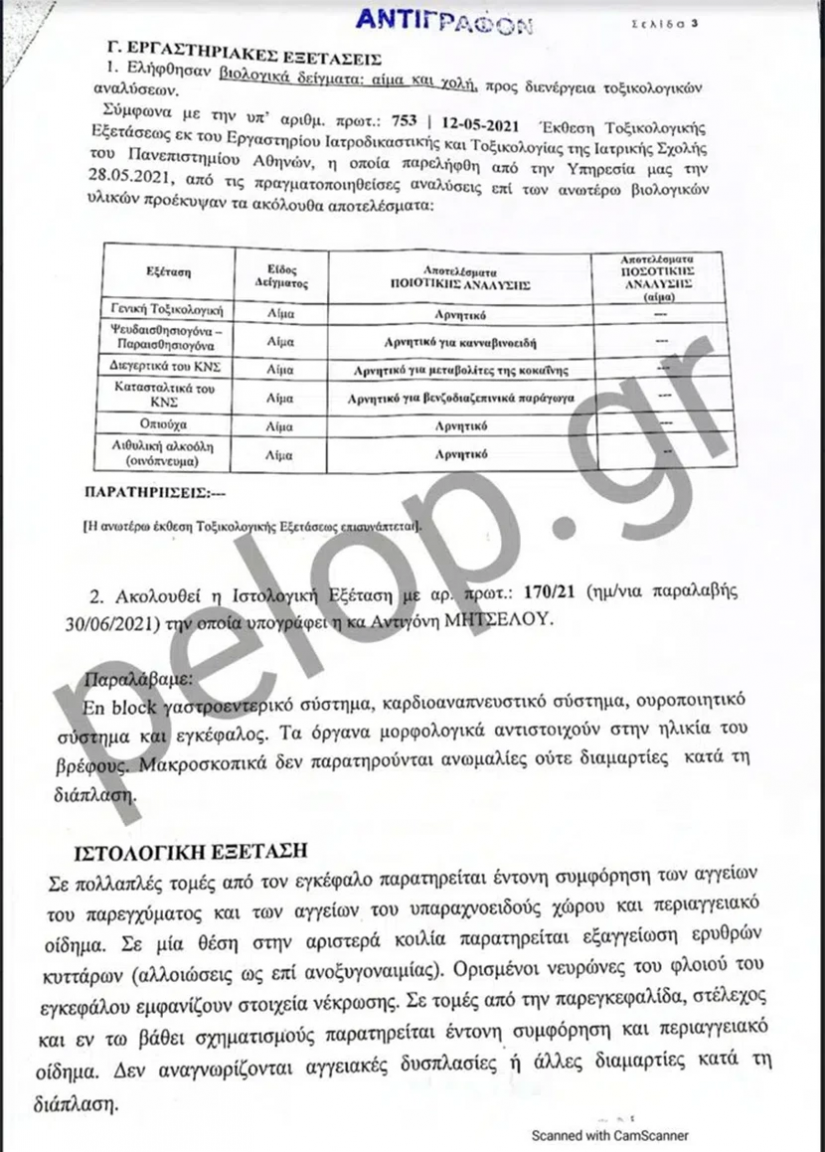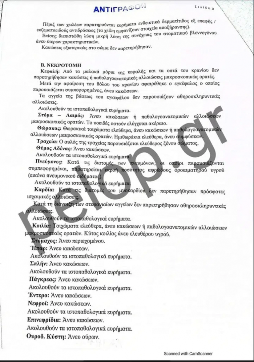 Στο πόρισμα αναφέρεται ότι εξωτερικά στο σώμα δεν βρέθηκαν κακώσεις. Επίσης, κακώσεις δεν βρέθηκαν στο κεφάλι, ούτε και σε άλλα σημεία όργανα του σώματος κατά την νεκροτομή που ακολούθησε. Η τραχεία ήταν ελεύθερη χωρίς την παρουσία ξένου σώματος, ενώ στους πνεύμονες εντοπίστηκε εικόνα πνευμονικού οιδήματος. Στην καρδιά δεν παρατηρήθηκαν ισχαιμικές ή αθηροσκληρυντικές αλλοιώσεις. Οι δε εργαστηριακές εξετάσεις, ήταν όλες αρνητικές σε τοξικές και άλλες ουσίες.