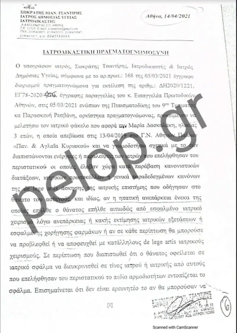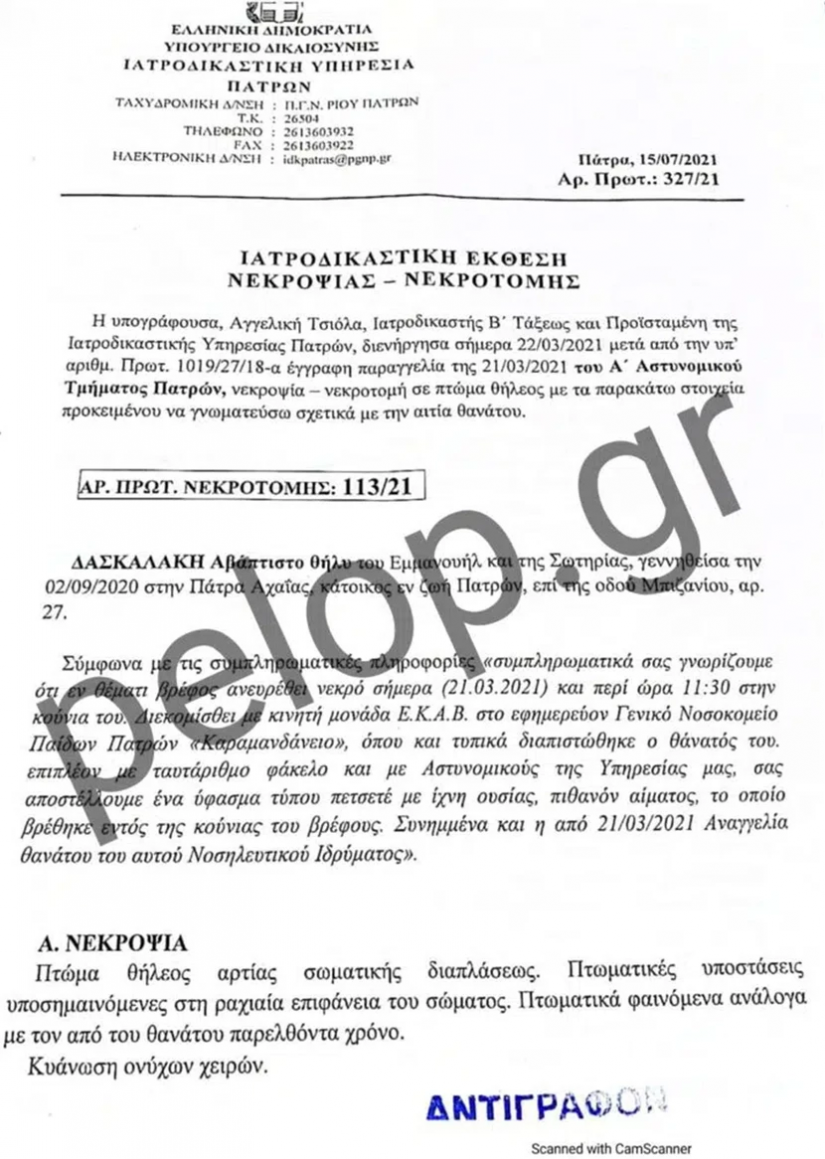 Όπως αναφέρει η τοπική σελίδα, στην ιατροδικαστική έκθεση νεκροψίας – νεκροτομής που διενήργησε η προϊσταμένη της Ιατροδικαστικής Υπηρεσίας Πατρών, ιατροδικαστής Αγγελική Τσιόλα, στις 22 Μαρτίου του 2021, αναφέρεται πως το αβάπτιστο τέκνο της οικογένειας Δασκαλάκη βρέθηκε νεκρό μια ημέρα νωρίτερα, δηλ. στις 21 Μαρτίου και περί ώρα 11.30 στην κούνια του. Διακομίστηκε με μονάδα του ΕΚΑΒ στο Καραμανδάνειο, όπου τυπικά διαπιστώθηκε ο θάνατός του. Μαζί, εστάλη από το 1ο Αστυνομικό Τμήμα και ένα ύφασμα τύπου πετσετέ με ίχνη ουσίας, πιθανόν αίματος το οποίο είχε βρεθεί στην κούνια του βρέφους.