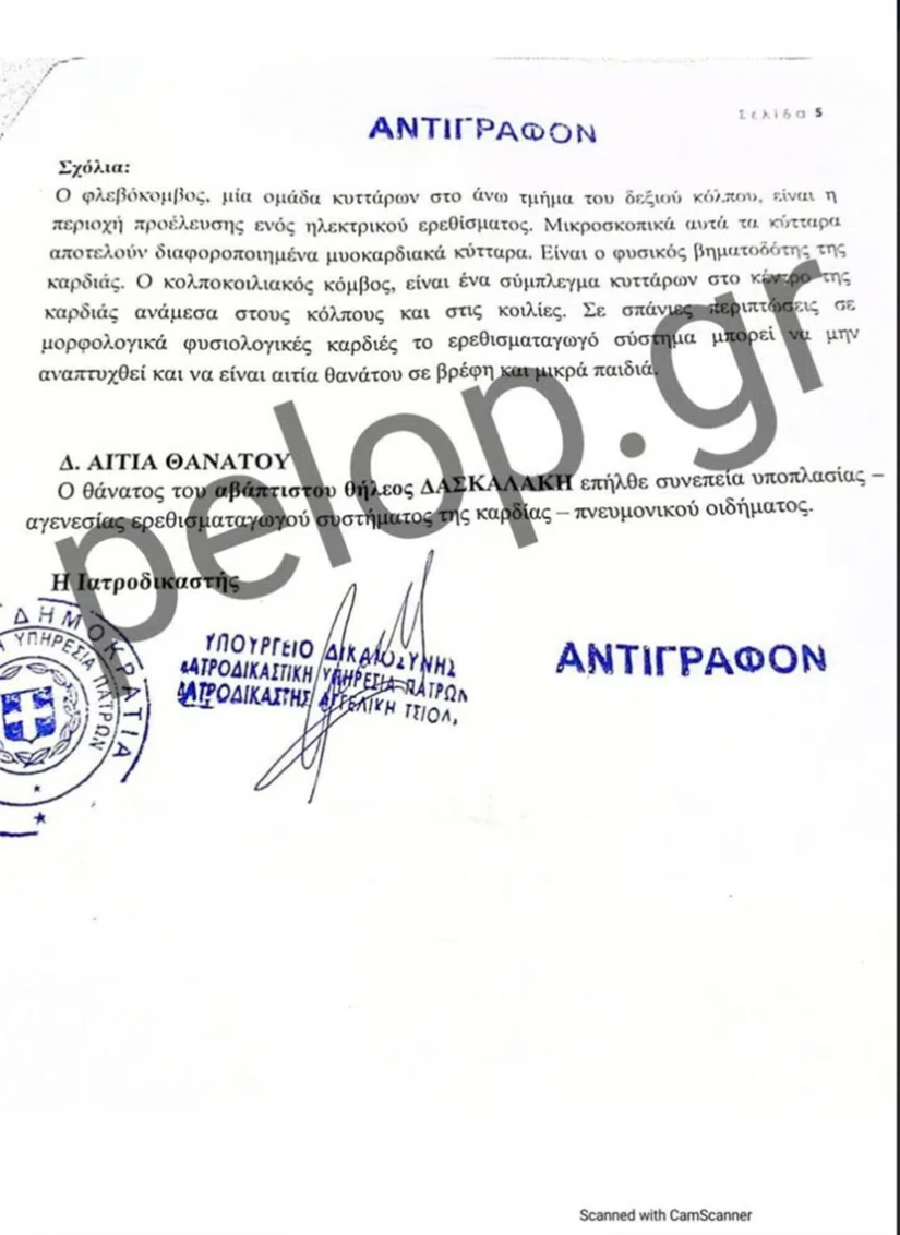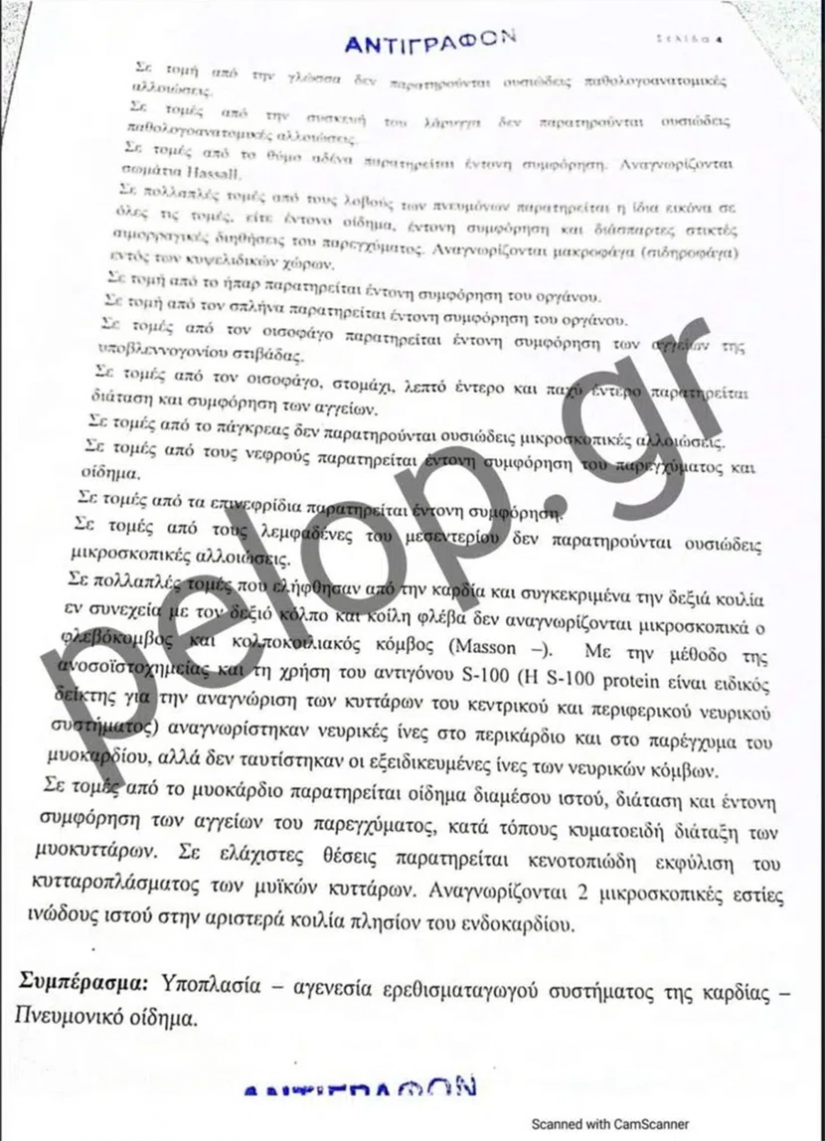 Επίσης, σημειώνεται ότι στο αποτέλεσμα της ιστολογικής εξέτασης καταγράφεται ότι κατά την εξέταση της καρδιάς δεν διαπιστώθηκαν ιστοπαθολογικές αλλοιώσεις ορατές στο σχετικό έγγραφο.