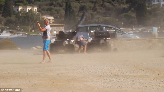 Ωστόσο, ο άνεμος που σηκώθηκε από τις τουρμπίνες του αεροσκάφους είναι τόσο μεγάλος που έσπασε την ανοιχτή πόρτα του πορτμπαγκάζ από ένα σταθμευμένο αυτοκίνητο ενώ οι τουρίστες που δεν είχα υπολογίσει τις συνέπειες, μετά βίας στέκονται στα πόδια τους.
