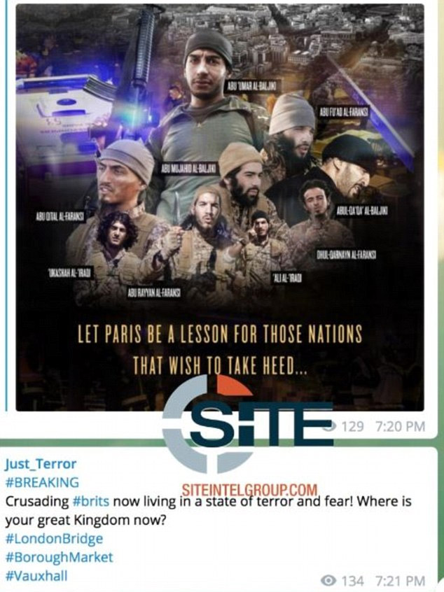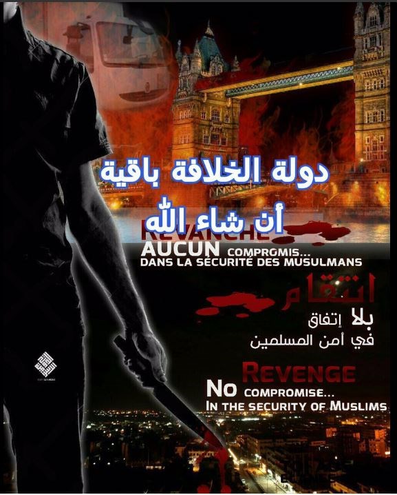 Την ίδια ώρα, στα κανάλια του Telegram, όπου χρησιμοποιούν οι τζιχαντιστές για την επικοινωνία τους, κυκλοφόρησε μία αφίσα που προκαλεί σοκ.Σε αυτή φαίνεται ένας άνδρας να κρατά στα χέρια του ένα μαχαίρι με αίματα, ενώ στο παρασκήνιο είναι φωτισμένη η Γέφυρα του Λονδίνου, όπου έγινε η επίθεση. «Εκδίκηση… Κανένας συμβιβασμός… Στην ασφάλεια των Μουσουλμάνων», έγραφε.