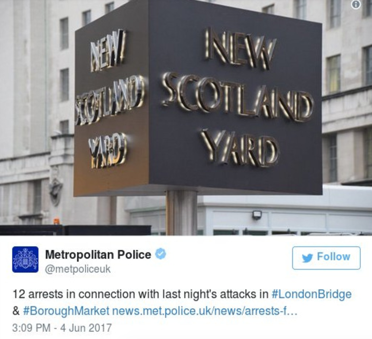 Η Βρετανική αστυνομία ανακοίνωσε 12 συλλήψεις την Κυριακή, 4 Ιουνίου: