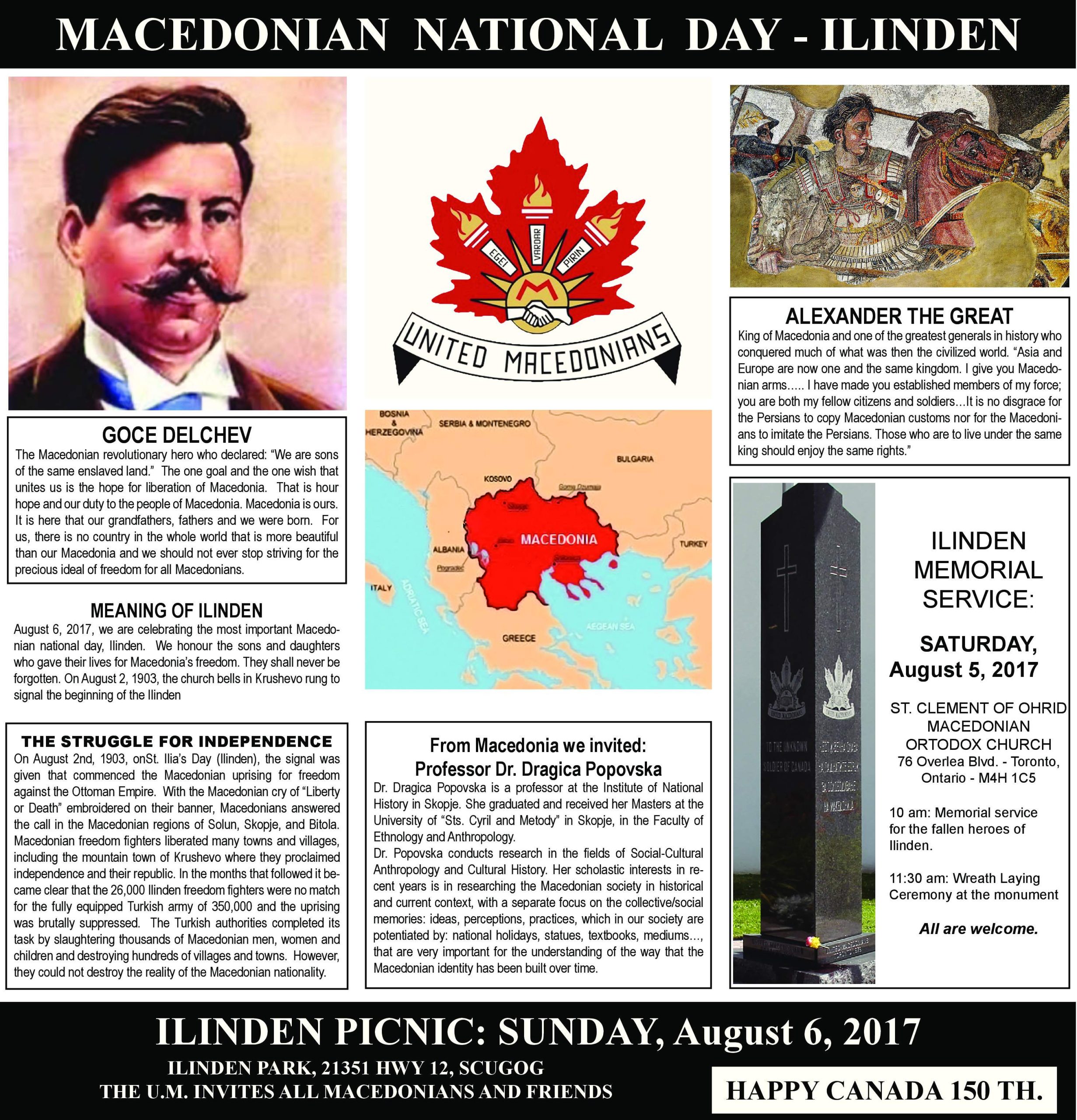 Εκατοντάδες Σκοπιανοί του Καναδά μαζεύτηκαν στις 6 Αυγούστου με την ευκαιρία, όπως ανέφερε η διαφήμισή τους στην εφημερίδα «Toronto Star», του εορτασμού της «Εθνικής Ημέρας της Μακεδονίας» (Ilinden) και, βεβαίως, για να εξαπολύσουν άθλια επίθεση εναντίον της Ελλάδας, η οποία δήθεν τους κλέβει την Iστορία και τον πολιτισμό τους. Τα μέλη της συγκεκριμένης οργάνωσης χαρακτηρίζονται από αρρωστημένο εθνικισμό και σύμφωνα με πληροφορίες αποτελούν την αιχμή του αλυτρωτισμού που πηγάζει από το κόμμα του πρώην πρωθυπουργού Νίκολα Γκρουέφσκι.