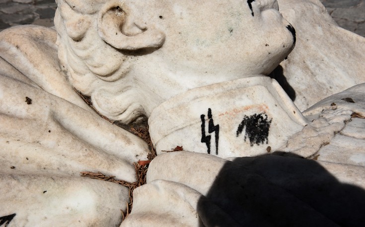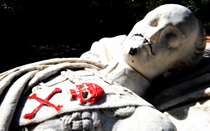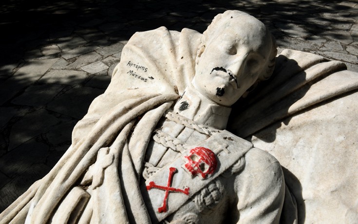 Το ταφικό μνημείο του Αλέξανδρου Υψηλάντη, που βρίσκεται μέσα στο Πεδίον του Άρεως βεβήλωσαν άγνωστοι, ζωγραφίζοντας πάνω του σύμβολα και μηνύματα με μαρκαδόρο ή μπογιά.