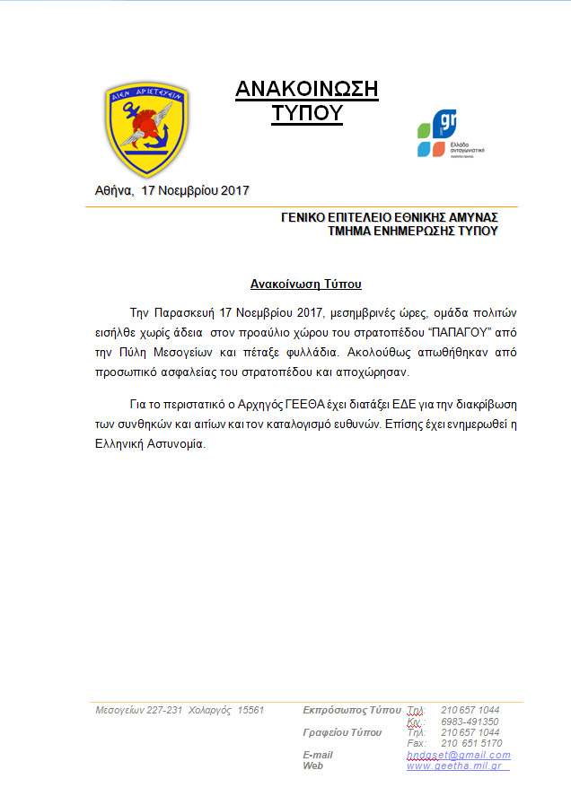 «Την Παρασκευή 17 Νοεμβρίου 2017, μεσημβρινές ώρες, ομάδα πολιτών εισήλθε χωρίς άδεια στον προαύλιο χώρου του στρατοπέδου “ΠΑΠΑΓΟΥ” από την Πύλη Μεσογείων και πέταξε φυλλάδια. Ακολούθως απωθήθηκαν από προσωπικό ασφαλείας του στρατοπέδου και αποχώρησαν. Για το περιστατικό ο Αρχηγός ΓΕΕΘΑ έχει διατάξει ΕΔΕ για την διακρίβωση των συνθηκών και αιτίων και τον καταλογισμό ευθυνών. Επίσης έχει ενημερωθεί η Ελληνική Αστυνομία».