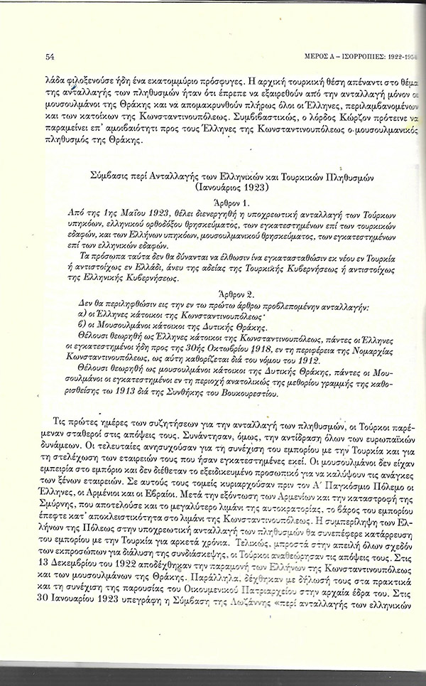Τον Ιανουάριο του 1923, προηγήθηκε η υπογραφή των δύο πρώτων συμβατικών κειμένων για την υποχρεωτική ανταλλαγή των πληθυσμών και για την ανταλλαγή των εκατέρωθεν αιχμαλώτων πολέμου και κρατουμένων. Παραθέτουμε στη συνέχεια αυτούσια τα δύο πρώτα άρθρα της Συμβάσεως για την ανταλλαγή των πληθυσμών (προσέξτε τη χρήση των όρων : ΕΛΛΗΝΕΣ κάτοικοι της Κωνσταντινούπολης -ΜΟΥΣΟΥΛΜΑΝΟΙ κάτοικοι της Δυτικής Θράκης)