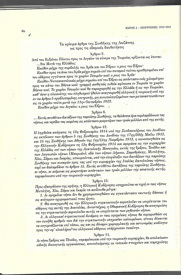 Παραθέτουμε στη συνέχεια αυτούσια τα άρθρα της συνθήκης της Λωζάνης για τις εδαφικές διευθετήσεις.