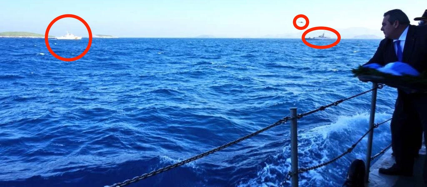 Κανένας όμως δεν εισήλθε εντός των Εθνικών Χωρικών Υδάτων, ενώ βρισκόταν εκεί ο Π.Καμμένος και ο ελληνικός Στόλος, όπως σαφώς φαίνεται στην φωτό που ο Π.Καμμένος ρίχνει το στεφάνι.