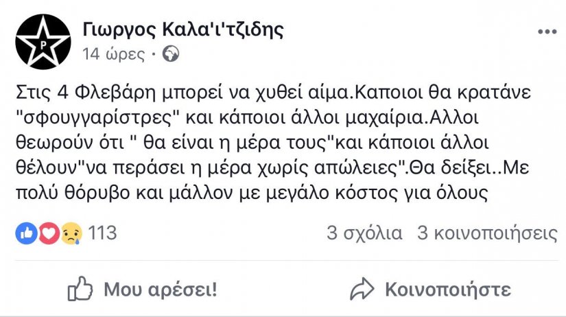 Με την ανάρτησή του οποία προειδοποιεί ότι την ερχόμενη Κυριακή κατά την διάρκεια του συλλαλητηρίου της Κυριακής 4 Φεβρουαρίου που θα πραγματοποιηθεί στο Σύνταγμα για το Μακεδονικό «μπορεί να χυθεί αίμα».
