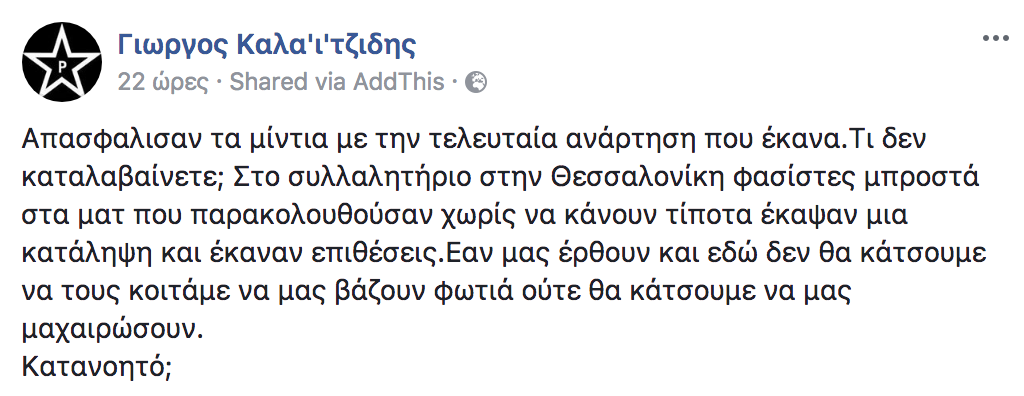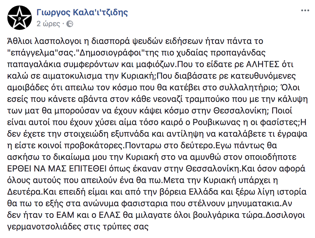 «Άθλιοι λασπολόγοι η διασπορά ψευδών ειδήσεων ήταν πάντα το «επάγγελμα»σας.”Δημοσιογράφοι”της πιο χυδαίας προπαγάνδας παπαγαλάκια συμφερόντων και μαφιόζων. Που το είδατε ρε ΑΛΗΤΕΣ ότι καλώ σε αιματοκύλισμα την Κυριακή; Που διαβάσατε ρε κατευθυνόμενες αμοιβάδες ότι απειλώ τον κόσμο που θα κατέβει στο συλλαλητήριο; Όλοι εσείς που κάνετε αβάντα στον κάθε νεοναζί τραμπούκο που με την κάλυψη των ματ θα μπορούσαν να έχουν κάψει κόσμο στην Θεσσαλονίκη; Ποιοι είναι αυτοί που έχουν χύσει αίμα τόσο καιρό ο Ρουβίκωνας η οι φασίστες; Η δεν έχετε την στοιχειώδη εξυπνάδα και αντίληψη να καταλάβετε τι έγραψα η είστε κοινοί προβοκάτορες. Ποντάρω στο δεύτερο. Εγω πάντως θα ασκήσω το δικαίωμα μου την Κυριακή στο να αμυνθώ στον οποιοδήποτε ΕΡΘΕΙ ΝΑ ΜΑΣ ΕΠΙΤΕΘΕΙ όπως έκαναν στην Θεσσαλονίκη. Και όσον αφορά όλους αυτούς που απειλούν ένα θα πω. Μετά την Κυριακή υπάρχει η Δευτέρα. Και επειδή είμαι και από την βόρεια Ελλάδα και ξέρω λίγη ιστορία θα πω το εξής στα ανώνυμα φασισταριά που στέλνουν μηνυματάκια. Αν δεν ήταν το ΕΑΜ και ο ΕΛΑΣ θα μιλάγατε όλοι βουλγάρικα τώρα. Δωσίλογοι γερμανοτσολιάδες στις τρύπες σας».